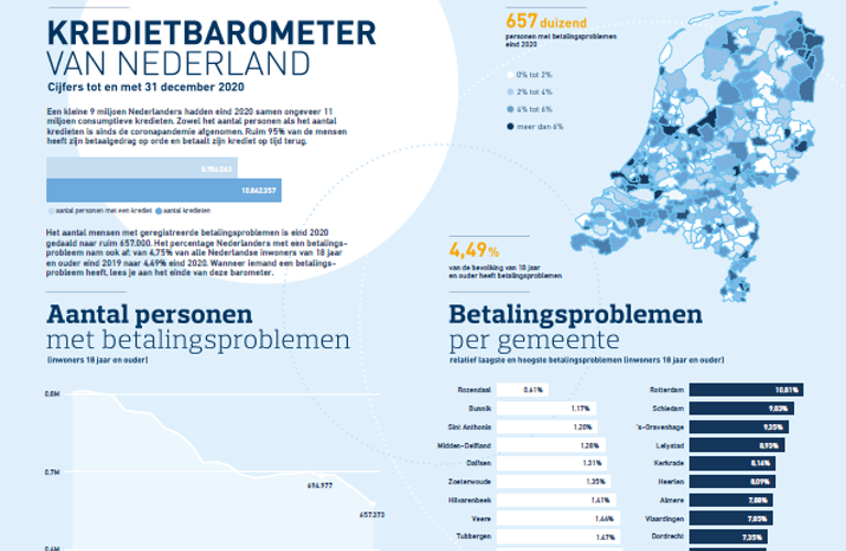 Tiel, 15 maart 2021 – Sinds de start van de coronapandemie is het aantal mensen met een consumptief krediet afgenomen. Eind 2019 hadden bijna 9,4 miljoen Nederlanders een consumptief krediet, eind december 2020 waren dit er nog geen 8,8 miljoen. Het percentage Nederlanders met geregistreerde betalingsproblemen nam ook af: van 4,75% van alle inwoners ouder dan 18 jaar eind 2019 naar 4,49% eind 2020. Dit blijkt uit de Kredietbarometer van Stichting BKR, een rapport dat inzicht geeft in het aantal kredieten en betalingsproblemen in Nederland. Het aantal mensen met betalingsproblemen daalde van ongeveer 695.000 eind 2019 naar ruim 657.000 eind 2020. Alleen onder jongeren tot 25 jaar stegen de betalingsproblemen in deze periode.